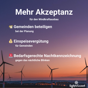 Accept af vindkraft opstår ikke af sig selv – den skal aktivt fremmes. Tidlig inddragelse af beboerne, muligheder for økonomisk deltagelse og tekniske forbedringer såsom behovsbaseret natmarkering hjælper med at reducere reservationer og se vindkraft som en mulighed. Hvis lokalbefolkningen får gavn af det, stiger støtten til energiomstillingen betydeligt.