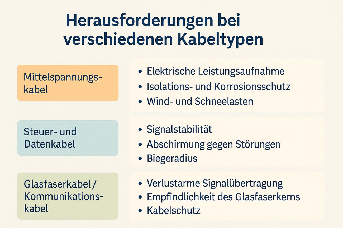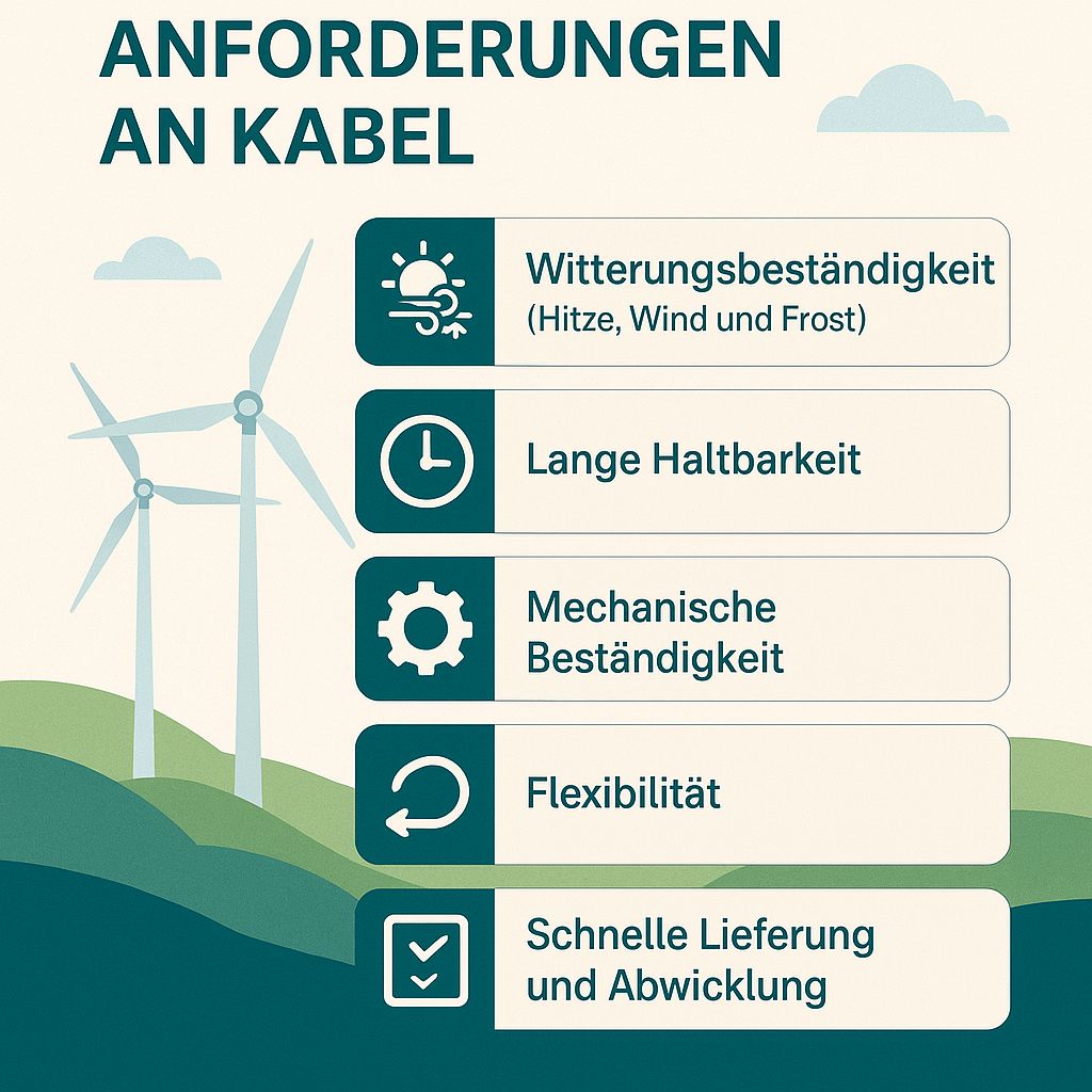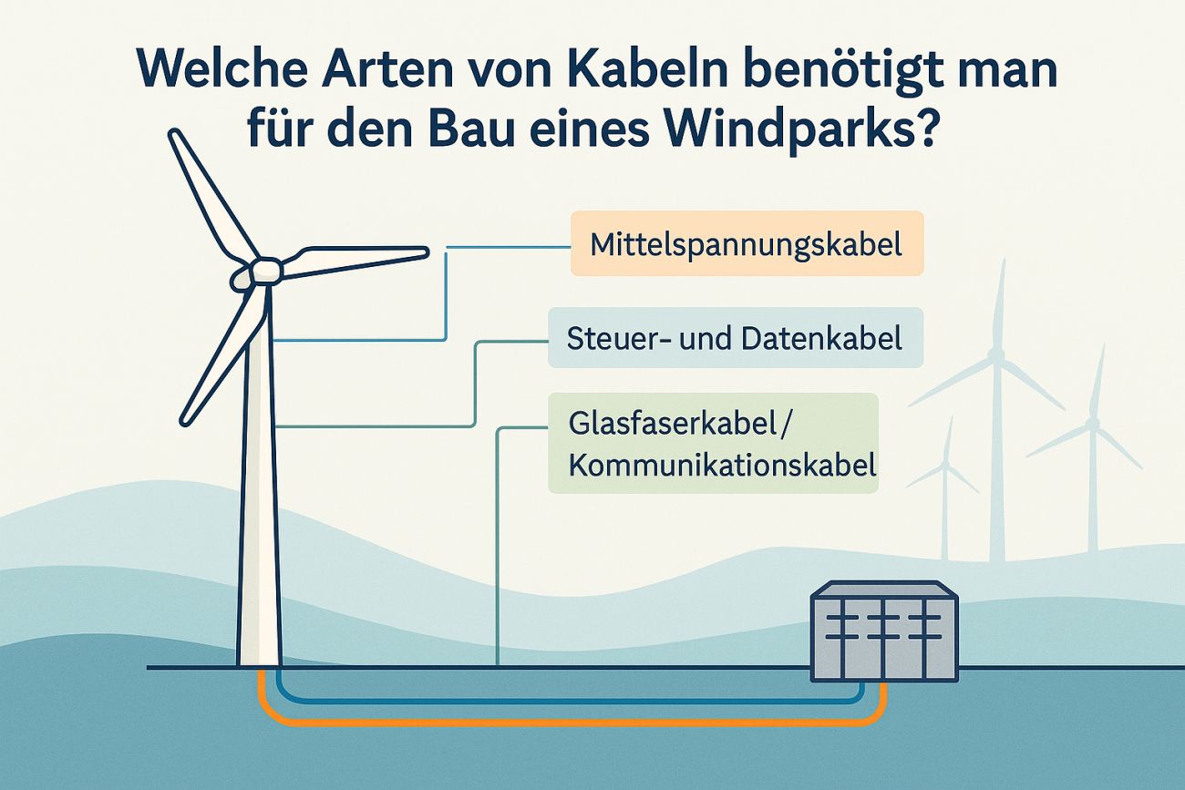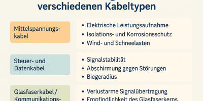 Kabelføring er et centralt element i enhver vindmølle og har en betydelig indflydelse på en vindmølleparks effektivitet, sikkerhed og rentabilitet. Allerede i planlægningsfasen af et vindenergiprojekt skal projektudviklere og operatører træffe vigtige beslutninger om kabelinfrastrukturen. Hvilke typer kabler er der brug for? Hvor løber de? Hvad er de tekniske krav? Og hvordan kan senere fejl eller strømsvigt undgås? Denne vejledning giver et omfattende overblik over alle de vigtigste kabeltyper, der anvendes i opførelsen og driften af en vindmøllepark. For hver type kabel undersøger vi dens specifikke funktion, de typiske udfordringer under brug og vigtige tekniske krav.