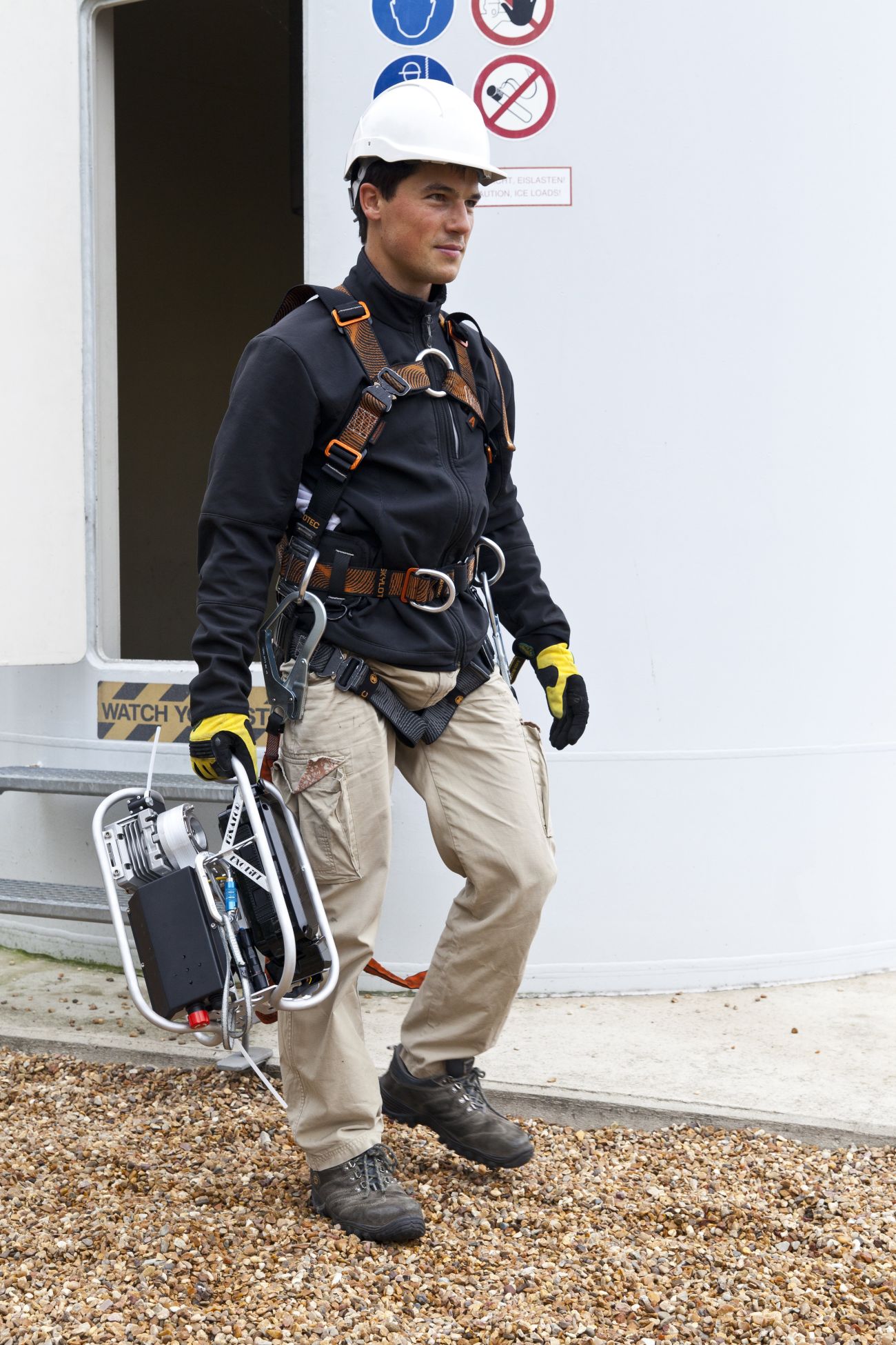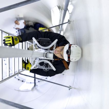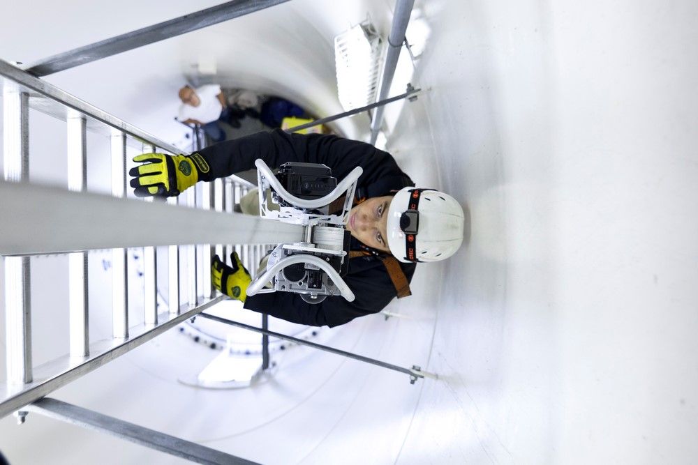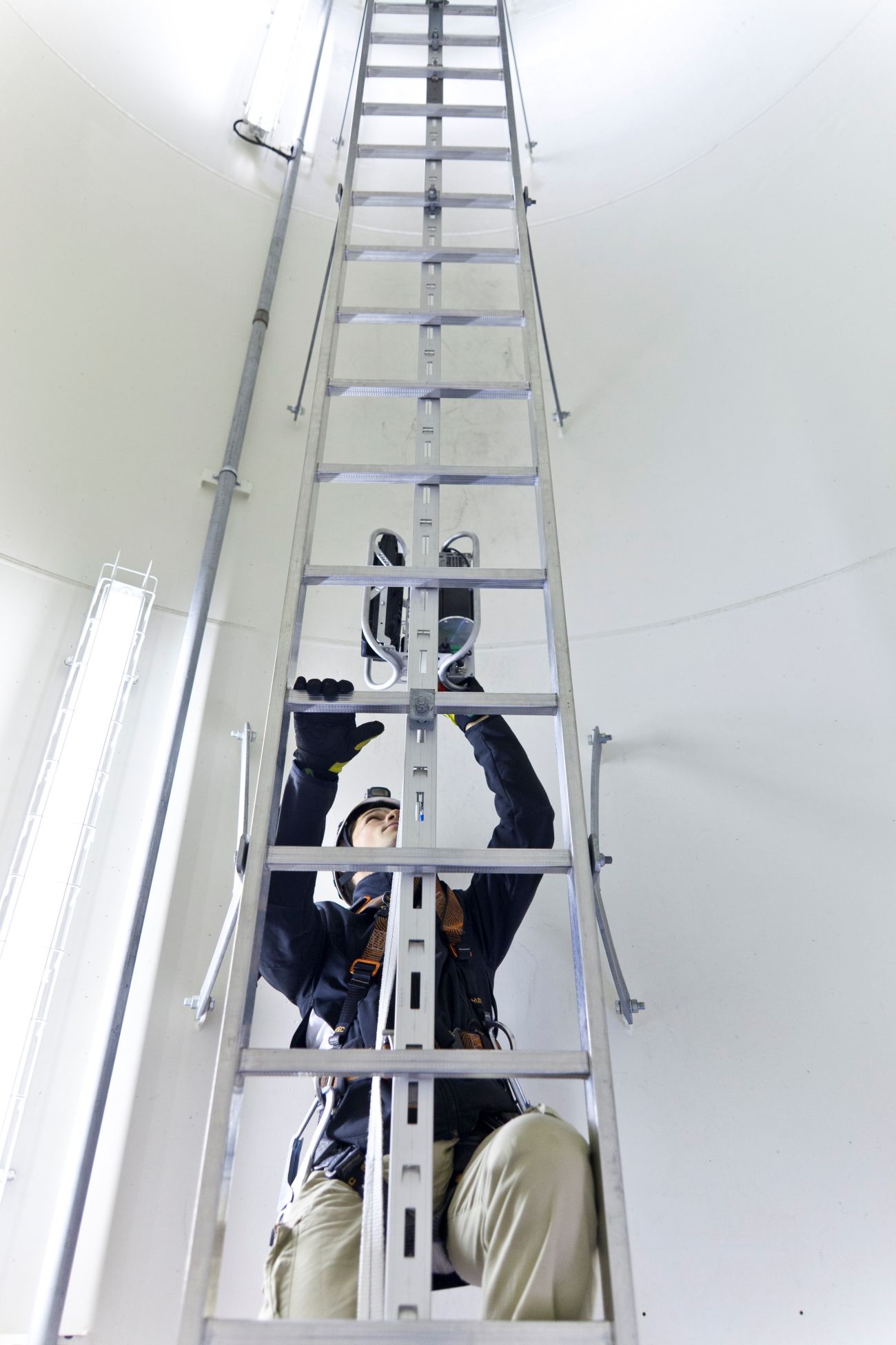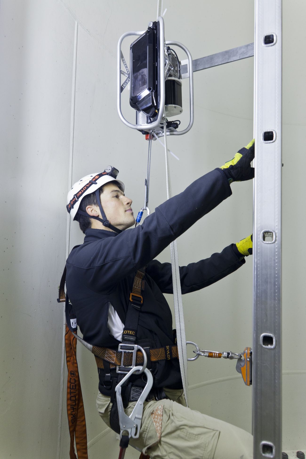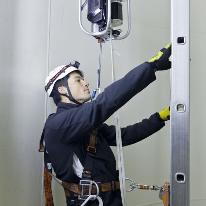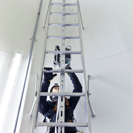 Eine Steighilfe für Windkraftanlagen, die mit einem fest an der Leiter installierten Gurt funktioniert!