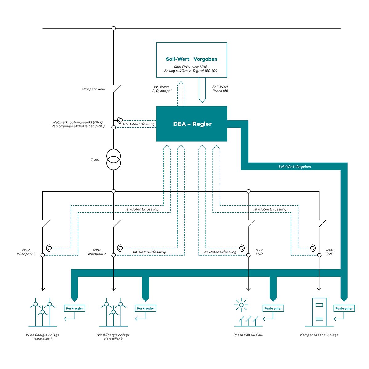 • DEA-styringen kan bruges til heterogene (vindmøller fra forskellige producenter) og homogene vindmølleparker, til nettilslutninger i høj- og mellemspænding og til koblede systemer på en netforbindelse som ××××××××× . vindmølleparker med solcelleparker